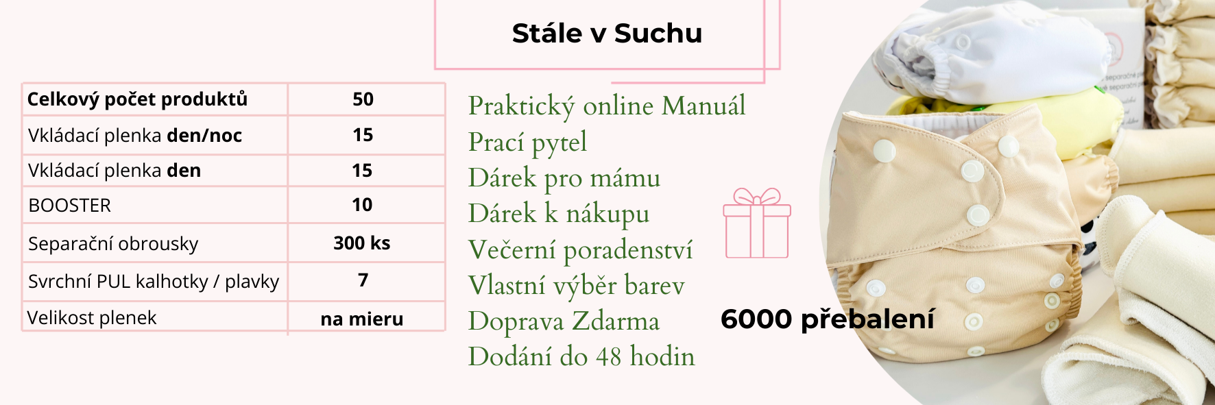Sada Stále v suchu je navržena pro rodiče, kteří chtějí maximální komfort, minimum starostí a naprostou svobodu. Obdržíte kompletní výbavu pro plné látkové přebalování s minimální frekvencí praní a maximální flexibilitou během dne i noci.