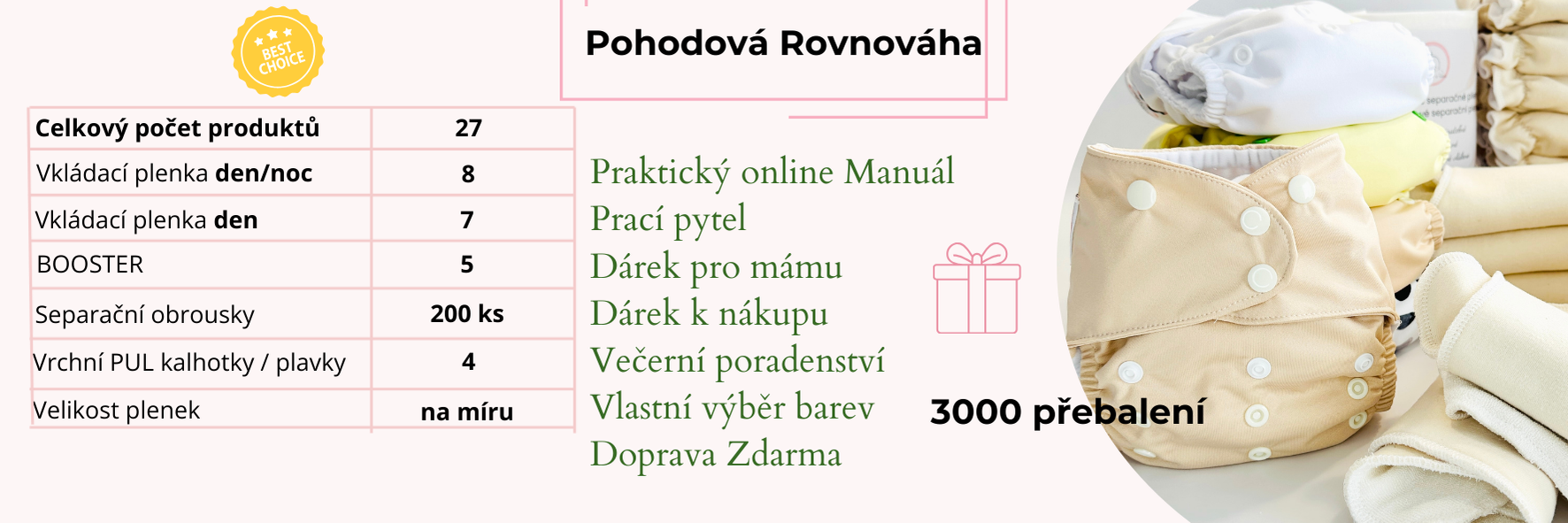 Poskytuje dostatek produktů pro pohodlné přebalování bez neustálého praní a zároveň prostor pro flexibilitu. Spolu s benefity ušetříte více než 3000 Kč, oproti koupi jednotlivých produktů. Sada nahradí 3000 jednorázových plenek.
