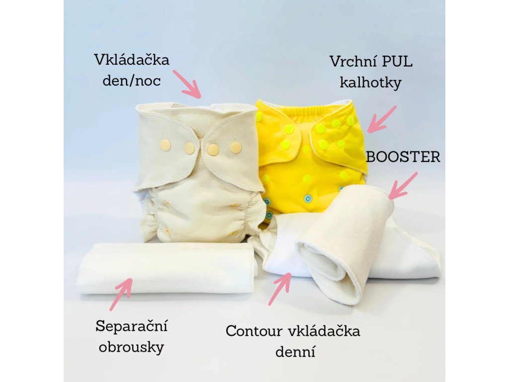 | Složení sady 0-3 roky (3-14kg): | 5x Vrchní PUL kalhotky (2xS a 3xM), 15x Vkládací plenka do PUL kalhotek (7xS a 8xM), 5x CONTOUR vkládačka (denní, tenká), 7x Booster, Separační ubrousky 100ks |
