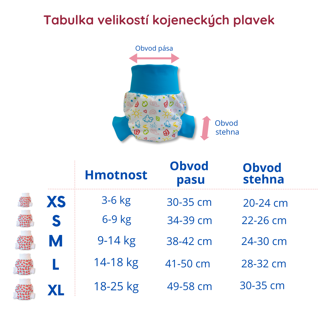 | VelVelikost (detail v záložce velikosti plavek): | XS (3-6kg) / S (6-9kg) / M (9-14kg) / L (14-18kg) / XL (18-25kg) |