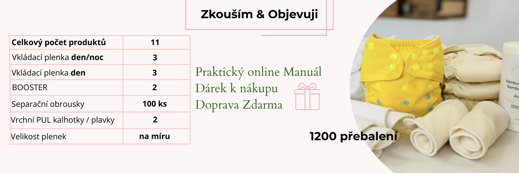 Sada Zkouším & Objevuji je určena pro rodiče, kteří se chtějí s látkovými plenkami seznámit.