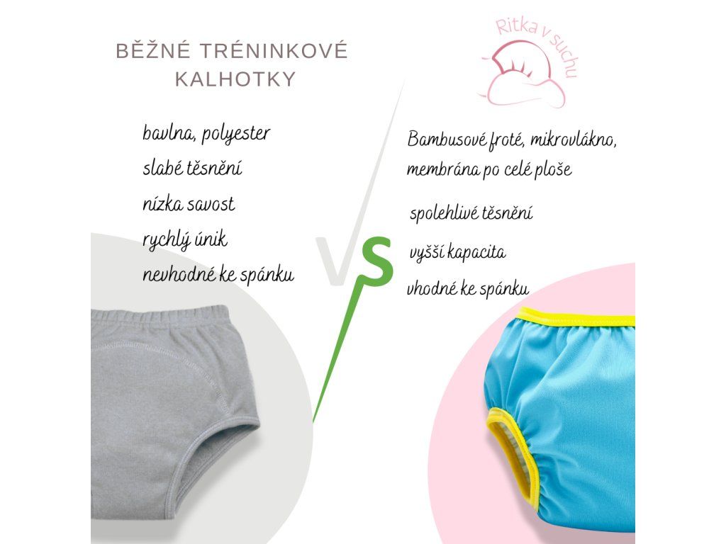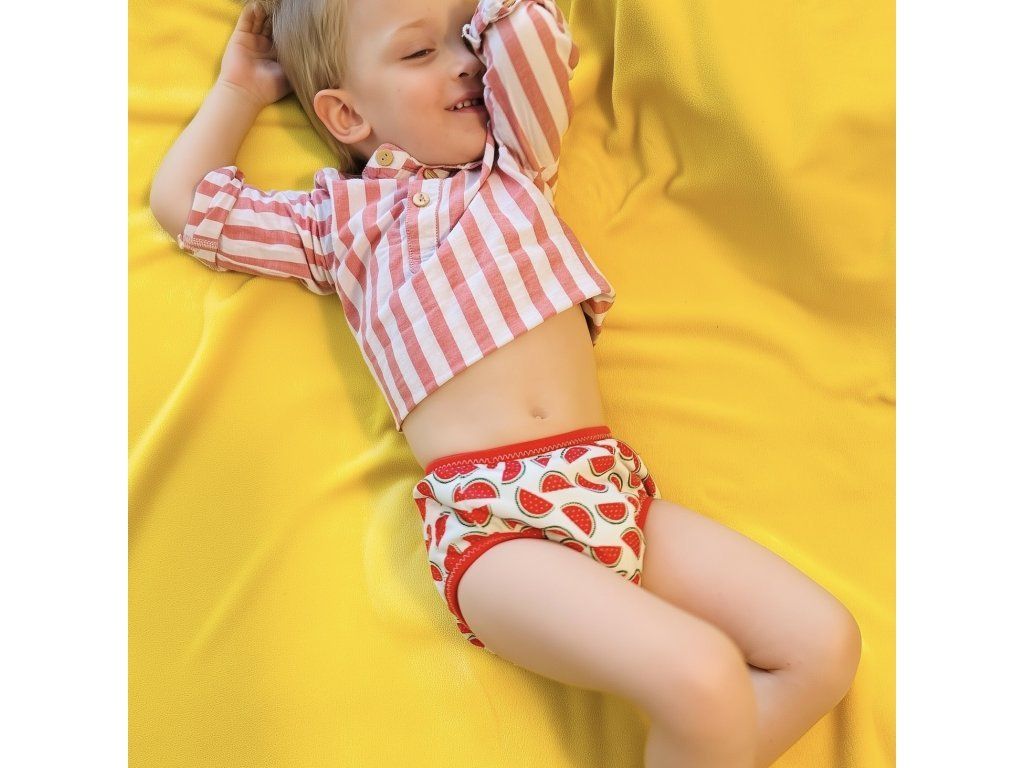 - Přírodní materiál: Vnitřní bambusová vrstva je měkká na dotek, hypoalergenní a antiseptická. Mokré kalhotky způsobují dítěti diskomfort a tím jej motivují k používání nočníku či toalety. Zároveň chrání zařízení před loužemi či většími nehodami.